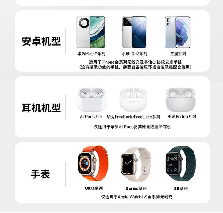 產(chǎn)品尺寸:102.5*67.5*119.5mm 包裝尺寸:125*85*65mm 產(chǎn)品重量:178g 輸入:5V/9V-2A 輸出:手機(jī)15W(Max)、手表2.5W(Max)、藍(lán)牙耳機(jī)3W(Max) 總輸出:15W 輸入端口:TYPE-C 輸入:5V/9V-2A 顏色:黑色 材質(zhì):ABS+PC(防火) 磁吸設(shè)計(jì),強(qiáng)力吸附,一放即充 三合一設(shè)計(jì),可同時(shí)充三臺(tái)設(shè)備 智能芯片,兼容更穩(wěn)定 6mm感應(yīng)距離0.1s響應(yīng),帶殼一樣充 即是支架,也是無線充,橫豎擺放,邊充邊玩 透明朋克設(shè)計(jì),鋁合金機(jī)身