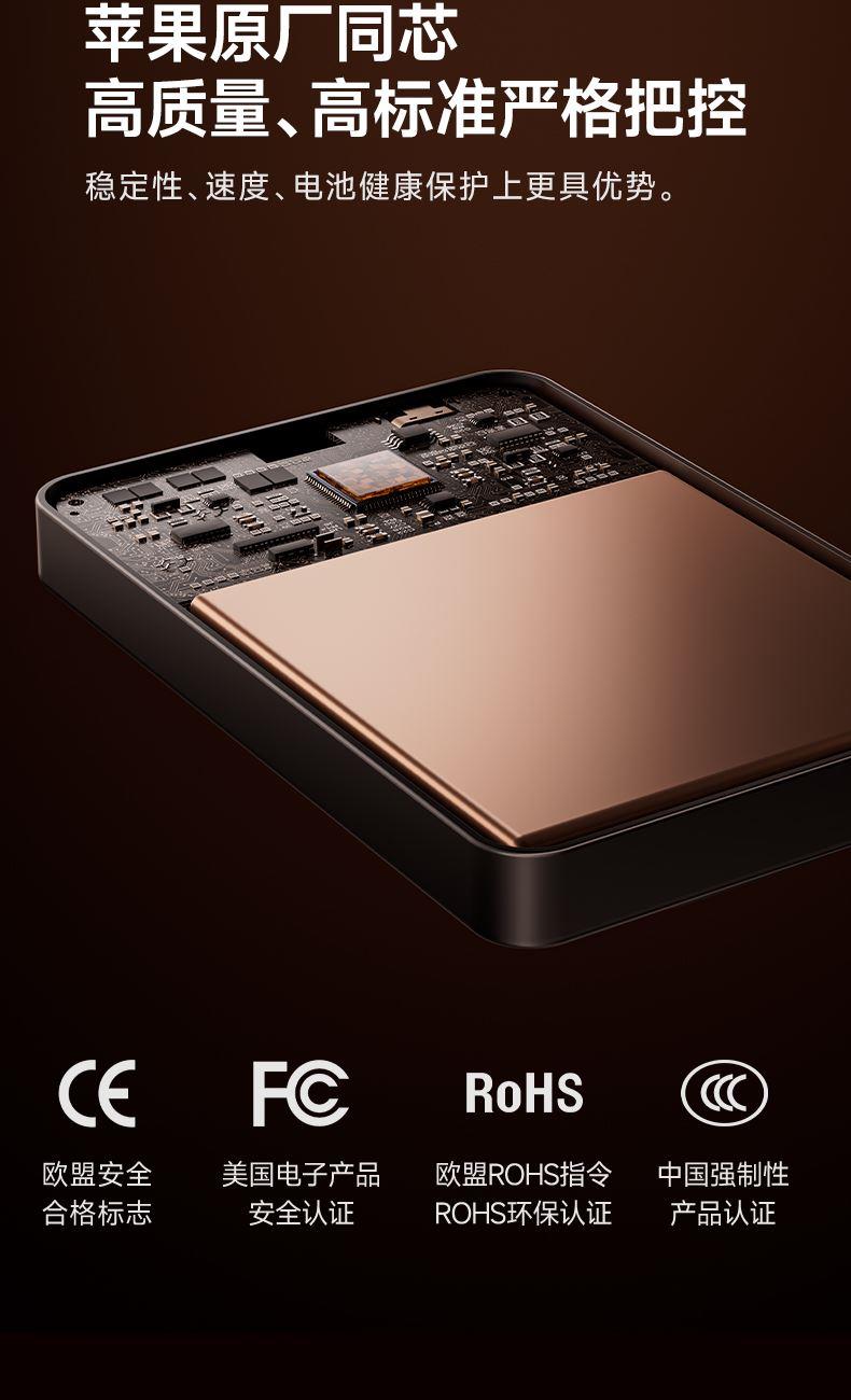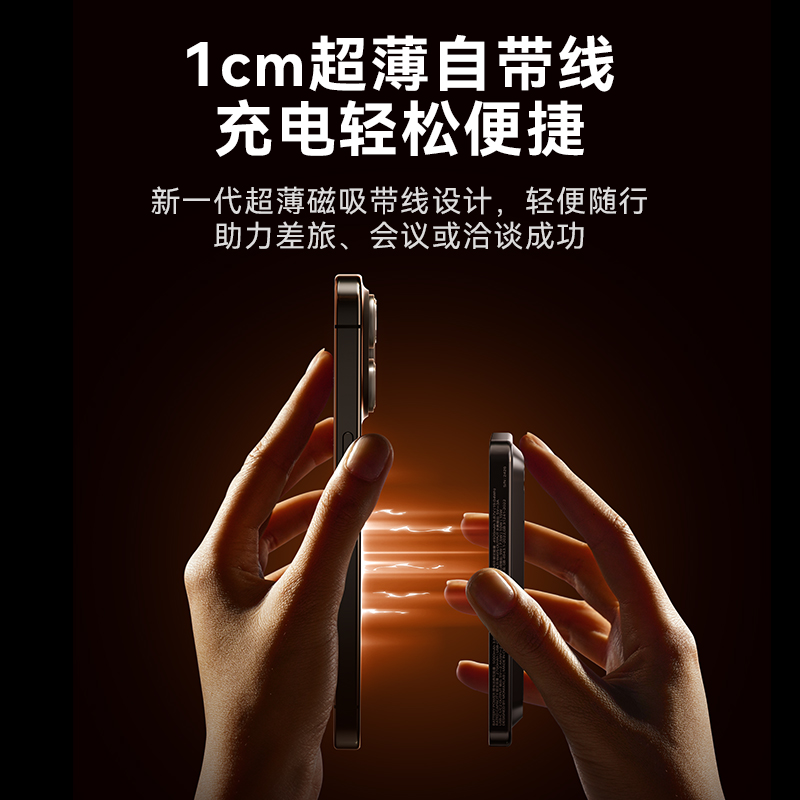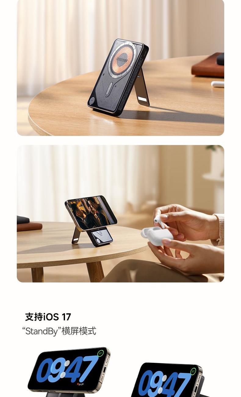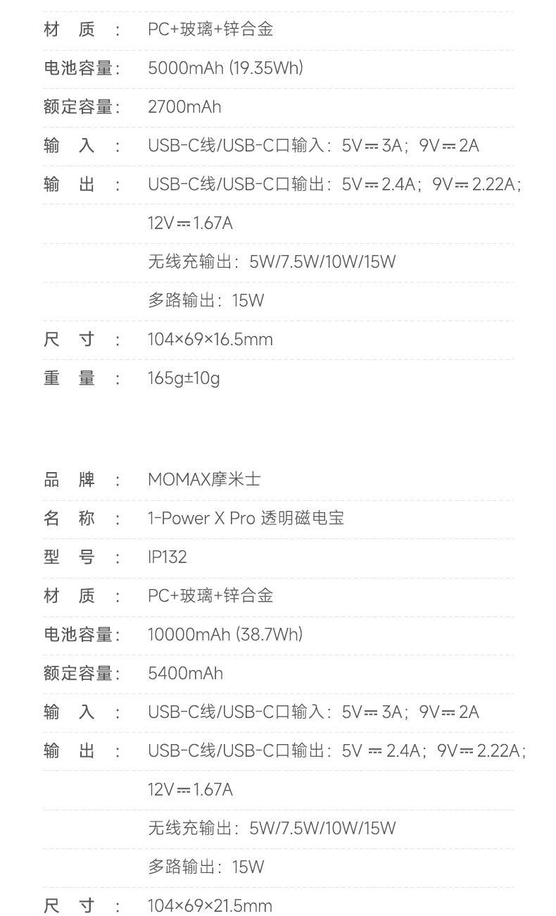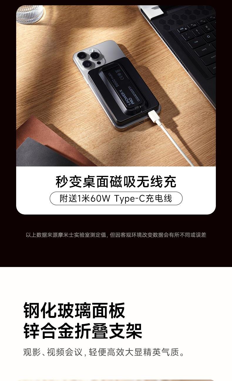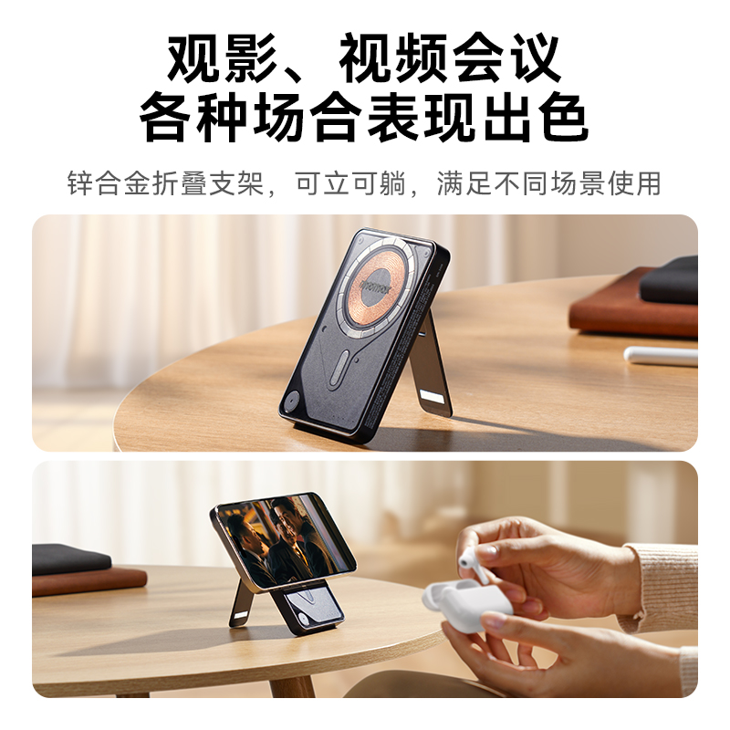 材質(zhì):塑膠+玻璃+鋅合金 電池容量:10000mAh (38.7Wh) 額定容量:5400mAh USB-C線/USB-C口輸入:5V?3A;9V?2A USB-C線/USB-C口輸出:5V?2.4A;9V?2.22A;12V?1.67A 無線充輸出:5W/7.5W/10W/15W 尺寸:104*69*16mm(不含支架) 重量:236g 3C認(rèn)證新國標(biāo),蘋果同廠電芯 10000mAh 有線20W+無線15W Max 隱藏線+鋼化玻璃面板+鋅合金折疊支架